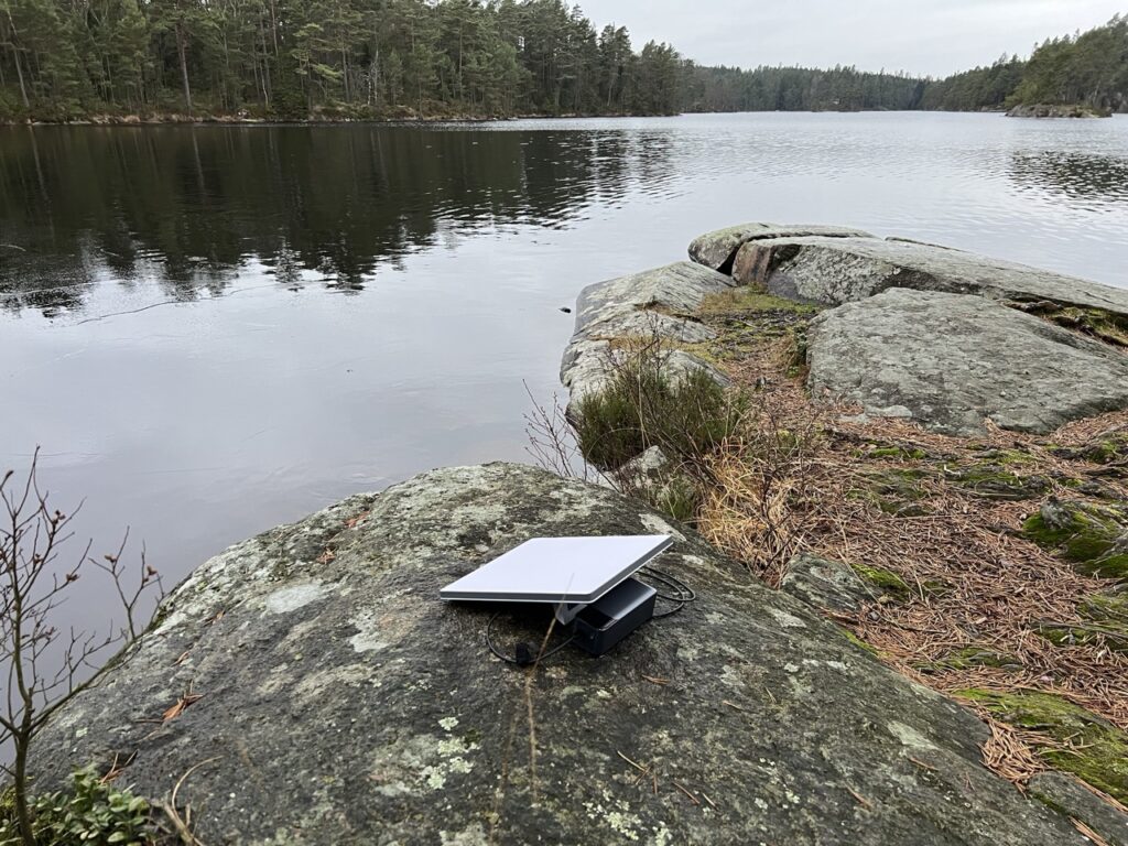 When actually using it on location, the Mini’s portability also means flexibility. I can easily reposition the dish during the day to avoid shadows or obstructions (just pick it up and move it a few yards if a tree starts blocking the sky in the afternoon). The kickstand makes it trivial to set down nearly anywhere – I’ve placed it on dirt, rocks, the hood of my car, a picnic table, you name it. It’s sturdy enough that I don’t worry about it even on uneven ground. And because the device is so light, I don’t hesitate to carry it from place to place. On one multi-stop camping trip, I set it up at our campsite during the evening, then the next morning we went to a day-use area by a lake; I packed the dish in its bag, took it to the lakeside, and had it running there for a few hours while we did some work and emails by the water. Try doing that with any other satellite setup – it simply wasn’t possible before at this level of convenience. Now, it is important to set expectations: if you’re backpacking on foot for miles, the Starlink Mini (plus the gear to power it) will add noticeable weight. The dish may be ~2.5 lbs, but the 50-foot cable is another few pounds, and any battery or power source is additional. I’d say the Mini is portable for vehicle-based travel or short carries, but it’s not the kind of thing you’d want to lug in a backpack up a 10-mile mountain trek unless absolutely necessary. In those cases, a satellite messenger or very lightweight solution might make more sense. That said, I have heard of some expeditions taking Starlink (the standard one) to base camps – so the Mini would only improve that scenario due to weight savings.